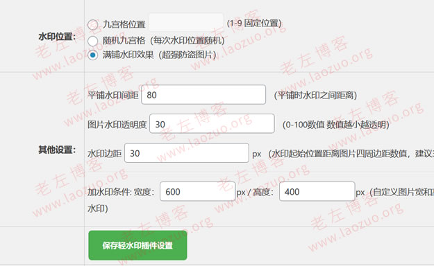 总结,老 左(LAOZUO.ORG)看到目前这款WordPress水印插件也做过优化,用户可以自定义水印设置限制,比如图片低于多少尺寸是不增加水印的。这款水印插件功能还是比较齐全的,我们可以试试使用到自己网站中,保护自己的版权。