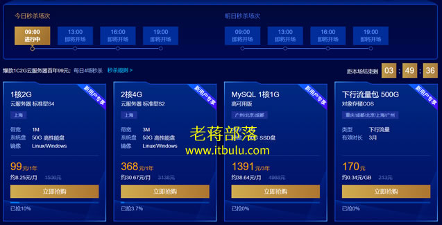 从活动方案看,腾讯云确实做的并没有阿里云复杂,直接很简单的秒杀限时活动。双12活动中,每天有四场活动。分别是9:00、13:00、16:00、19:00四个时间段。