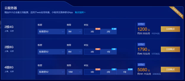 这里我们可以看看到2核4G内存5M带宽三年仅需要1200元,其他更有最大10M带宽的服务器可以选择。