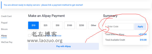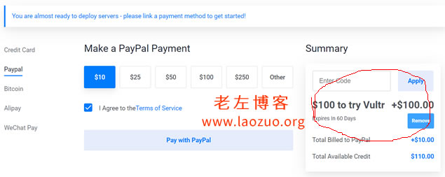 这里我们可以看到赠送100美金,同时有效期是60 DAYS,看到没有?这里又来一个知识点,不支持支付宝和微信付款,如果你选择会提示”Alipay may not be used with this promo.”,只支持信用卡和PAYPAL,然后我们对应照做吧。