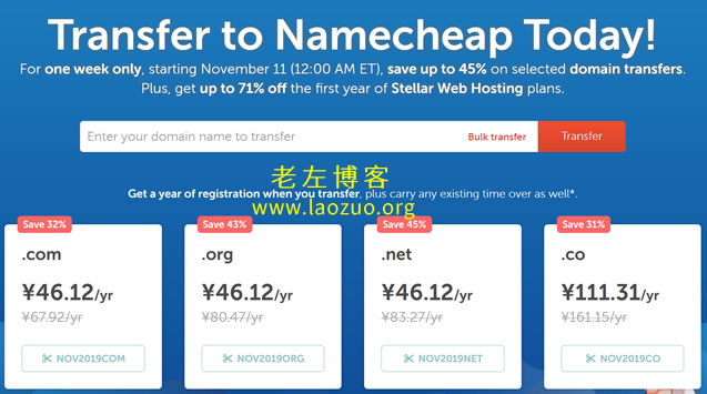 今天老 左有收到Namecheap的邮件提醒关于双11活动域名转入活动还有两天结束,这次是关于目前正在进行的域名转入活动,如果我们有在其他域名注册商需要续费的域名,可以直接通过转移域名到Namecheap商家来省钱续费,这个也是老 左喜欢采用的方式。毕竟我们站长有些时候还是比较抠门的,宁可利用点时间,然后用来省点成本。