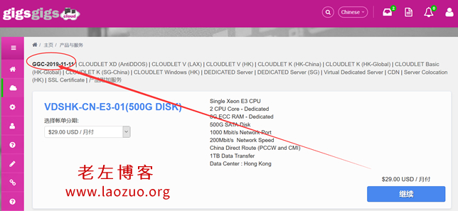 这里我们可以从订单菜单选择,看到有GGC-2019-11-11分类选项,然后可以看到有两款香港VDS,以及一款香港高防服务器。