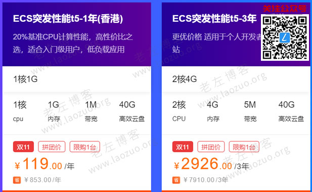 这里我们可以看到目前阿里云双11拼团活动中,针对新注册用户中国香港服务器有两款套餐,一款是基础的年付119元服务器,其实这个配置对于基本用途的来说建站肯定是够用的。如果我们需要配置较高和带宽较好的,可以选择三年2926元套餐,看似成本一次投入高,但是平均年付还是便宜的。