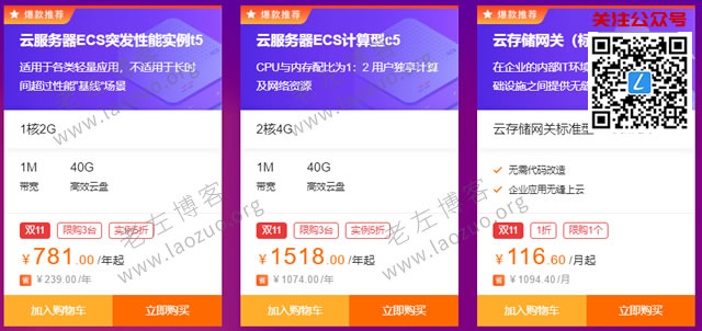 以上是老左整理的阿里云双11活动全部的产品活动。对于我们个人而言还是选择新用户爆款产品,香港云服务器119一年,以及大陆服务器229三年的这款,如果配置较高的需求可以选择799三年或者1399三年云服务器。更多阿里云促销活动可以参考:https://www.laozuo.org/aliyun