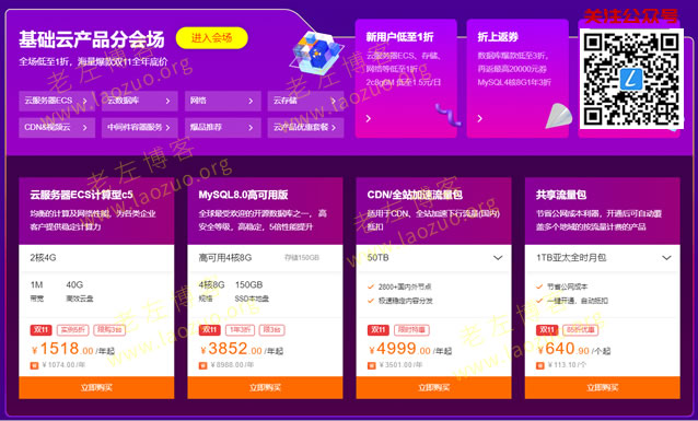 每年阿里云的活动策划老左(LAOZUO.ORG)还是非常喜欢的,第一活动力度虽然集中在新用户,这个大部分商家都是这样子的,第二我们可以看到较多的互动性,今年我们可以领取代金券续费,也可以参加分享抽奖活动,老 左还得到一件T恤。不废话,我们一起看看阿里云双11活动主会场到底有哪些值得我们选择的。