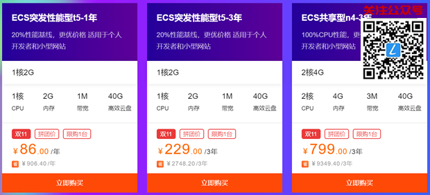 这个活动阿里云全网是最低的,1核2GB内存1M带宽一年86元,三年229元,适合我们用户入门级个人建站和企业建站,当然是需要新用户才可以。如果我们需要更高配置则需要用到下面1折活动商品。