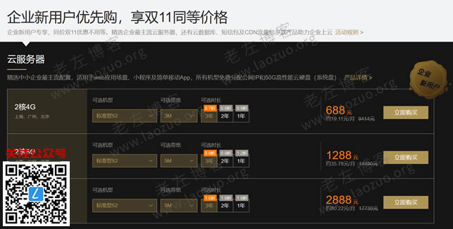我们可以看到年付88元云服务器2GB内存方案适合入门练手,真做网站的话,老 左建议选择2核心4GB内存5M带宽云服务器,记得之前活动是1440的,如今三年只需要998元(这个数字好像有点熟悉,998,只要998)
