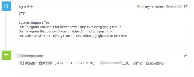 直接用中文工单也是没有问题的。然后立即得到答复,这个响应速度还是不错的,于是就这么给我启动。也不清楚是什么问题,不知道是不是每次都要人工处理?还是意外?本来今天要体验这款机器的,就暂时丢着,下次再体验。
