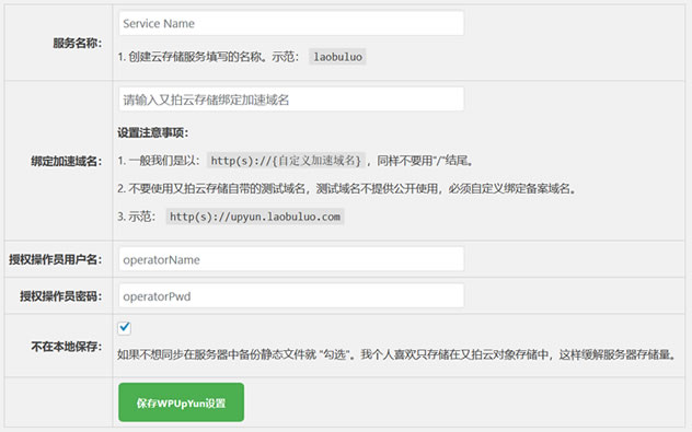 这里我们可以看到插件中包括需要填写的又拍云对象存储的相关参数,理论上我们可以去又拍云创建对象存储空间,以及绑定自己的自定义域名即可。目前又拍云对象存储不支持使用商家自带的免费域名,需要我们自己绑定自定义域名,当然绑定的域名需要是已经BA过的才可以接入。