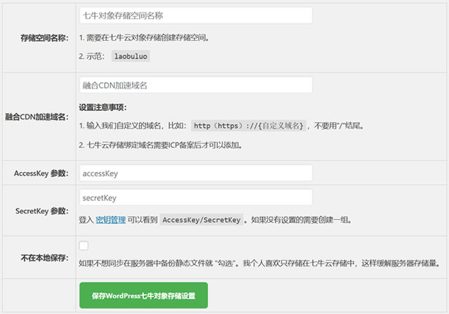 这里我们在激活插件之后在侧边菜单可以看到配置选项按钮,然后根据参数需要填写我们七牛云对象存储的参数。我们根据实际需要进行创建存储空间。