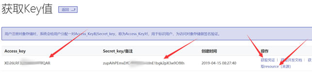 我们需要的Access_key、Secret_key、获取凭证、获取Resource来源,这个四项都是需要的。以及需要的绑定的域名,我们可以用接入过的二级域名。