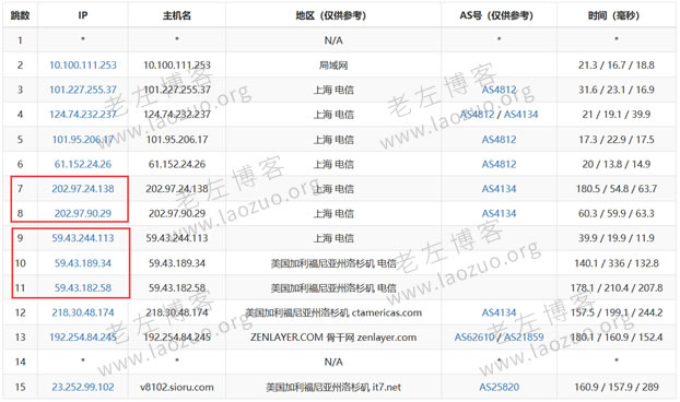这里我们先梳理一下,关于CN2 GT 线路省级出口一般是 202.97 节点(163骨干网节点),在跨境时才进入 CN2 骨干线路,然后节点一般是 59.43 开头。下面我们用CN2 GT IP地址走一趟上海节点试试。