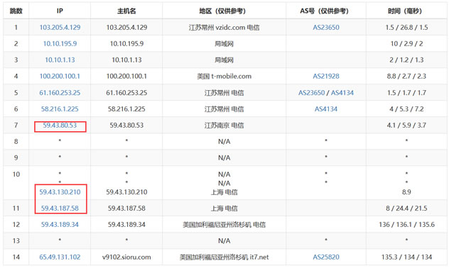 CN2 GIA节点线路测试,如果我们本省中有节点,会接入这个CN2节点。如果本省有CN2节点(江苏南京),所以CN2 GIA线路直接在南京接CN2节点(59.43),然后再从上海出口。但是,如果CN2 GIA线路中,本省没有CN2 GIA节点,会就近接入北上广202.97节点,再接入59.43节点。