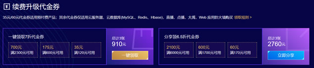 这里我们可以看到还有续费升级代金券领取。如果有需要续费云产品的可以领取使用。好歹有比没有强,肯定续费没有新购买便宜。