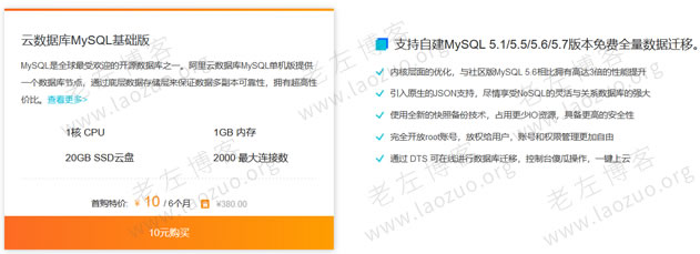 老左在上个月的时候有分享过”体验阿里云云数据库RDS开通与设置MySQL云数据库教程“体验到云数据库的配置和创建账户,因为之前没有使用过就原价开通一台进行演练撰稿的。今天有看到阿里云针对未曾开通过RDS云数据库的用户有不错的体验优惠,半年只需要10元,这个价格确实是比较好的。