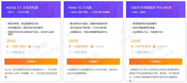 如果我们需要其他云数据库产品的,老左有看到他们对于MYSQL主备双机版、Redis 1G主从版等都是有部分折扣。