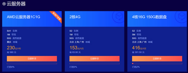 我们可以看到即日起未说明结束时间,可以每天两场有秒杀活动,且每次产品是有不同的,其中包括服务器、数据库、短信等业务。