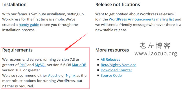 其实我们在WordPress官方网站下载最新版程序的时候,有文档已经提到建议的最佳PHP与MYSQL数据库版本,以及推荐的WEB环境支持。
