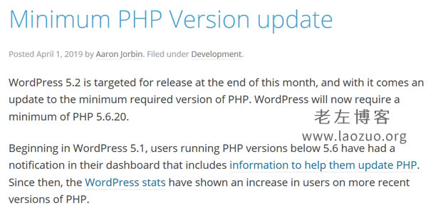有点扯远了,今天这篇文章的目的是老左看到WP官方网站有提到在四月底会更新WordPress 5.2版本,且需要PHP最低支持需要5.6.20。如果我们服务器WEB配置是低于PHP5.6.20版本的,且后面软件升级之后需要升级的建议提前做好准备升级PHP。