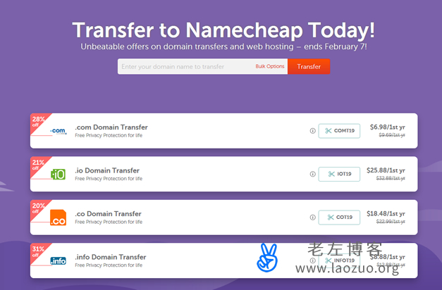 老左首先祝福大家春节快乐,最近几天大家上网应该不是很多,主要时间多陪陪家人和孩子。如果我们有Namecheap账户的同学们应该都收到来自官方的邮件是关于域名转入优惠活动的。如果我们有需要点馒头钱的,且有域名在其他注册商需要续费的可以通过转入NC的办法续费省钱。