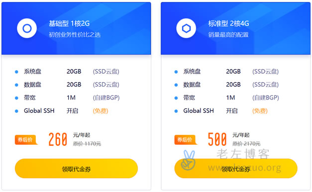 同时,还有免费20GB云存储以及SSL证书服务。在这篇文章中老左就简单分享下新上线的活动,对于他们家的产品原价确实是比较高的,相比阿里和腾讯云没有优势,但是折扣后还是可以的。之前老左参与的一台香港云主机搭建个网站还是可以用的。如果对于带宽要求较高,那肯定不适合,这次好像是1M带宽起步的,上次是2M带宽。