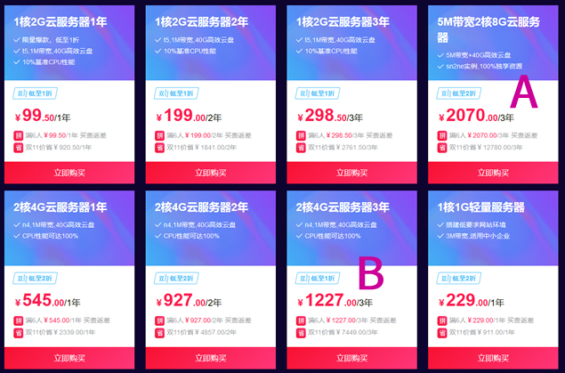 其实比较有性价比的是A:2070元三年”5M带宽2核8G云服务器”,以及B:1227元三年”2核4G云服务器”。主要还是看我们新人用户选择,如果准备长期使用,三年是比较靠谱的,毕竟我们可以看到每一次低价活动都是只能新人,明年我们要么选择高价续费,因为没有新人资格购买低价配置(前提是我们准备长期使用)。