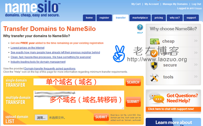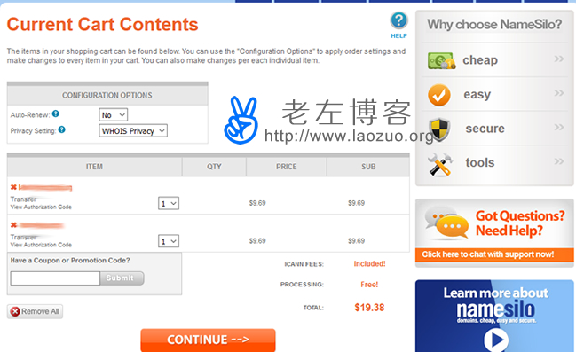 这里我正常的转入至Namesilo商家,因为转入教程都类似,所以老左参考之前的一篇文章”记录域名转入Namesilo域名注册商图文过程“中的一些截图内容直接复制过来,就不在重新写了。