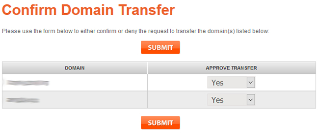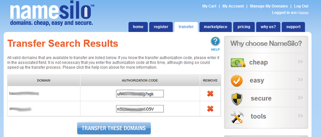 这里我们需要核对当前域名的转移码信息,然后点击Transfer these domains按钮继续。