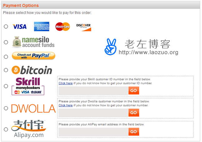 这里我们可以用信用卡、PAYPAL、支付宝等多个方式付款。付款完毕之后,我们可以在后台Domain Transfer菜单中看到域名当前的状态,这里我忘记截图了。