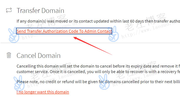 这里老左从Rebel后台找到当前需要转出的域名,但是没看到解锁的按钮,直接看到有获取转移码的按钮,所以点击直接获取(Send Transfer Authorization Code To Admin Contact)。