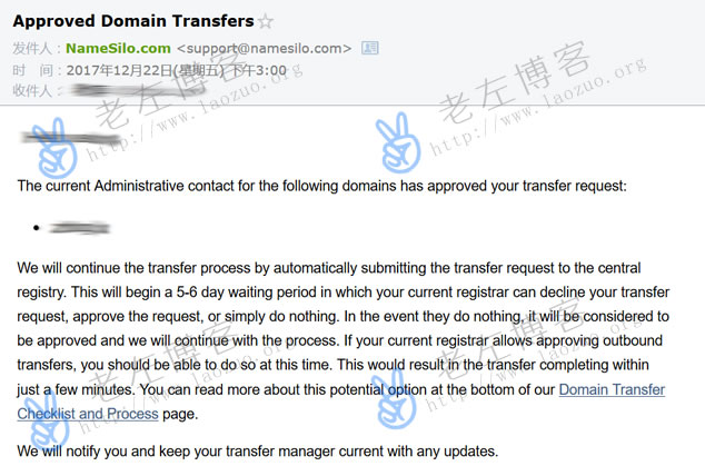 再次等待三分钟,收到第二份邮件,确认域名是转入过来的,但是需要5-6天才可以转入。