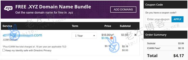 从这些迹象可以看到,如今移动网络市场对于传统PC、域名市场还是有一定的影响的,前几年域名交易价格涨幅惊人,最近好像看到域名交易也比较冷清。如今域名商家推出一些促销活动,对于有实际需要注册域名的用户还是可以酌情选择。今天老左要体验的是来自Directnic商家,新注册.COM域名3.99美元。
