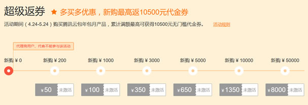 根据消费订单 金额,可以激活赠送的代金券。比如消费200元购买云服务,赠送50元代金券,可用于消费、续费、升级用途。