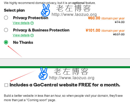 这里我们按照正常购买域名的方式,将域名添加到购物车中看看价格是否变动。当然,在选择域名过程中,我们需要取消隐私保护等附加产品,因为隐私保护在这里是不免费的。