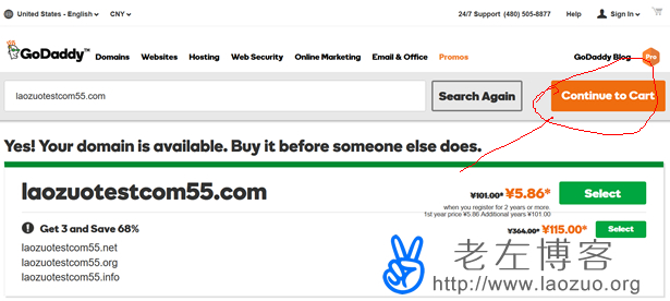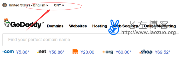 无论我们进入官方网站是何种语言和币种,老左个人建议选择English,以及CNY人民币币种,我测试后语言好像简体中文也可以,但是我习惯用英语语种,但是币种一定要用CNY,如果是美元币种那.COM域名就是12.00+美金。