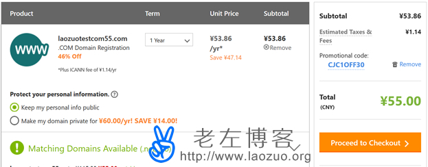 在这篇文章中,老左准备分享一篇新注册.COM域名55元/首年的方法,因为如果我们仅仅默认去注册并不是55元,需要几个简单的小技巧才可以,这个也是前一段时间随便点击后发现的。