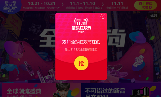 今年与去年有些类似,预热活动时间比较长,从2017年10月20日零时开始就启动抢红包预热活动,如果需要试试手气的,也可以参与进来,1111元红包也没有期待,好歹也蒙这么三五块钱吧。