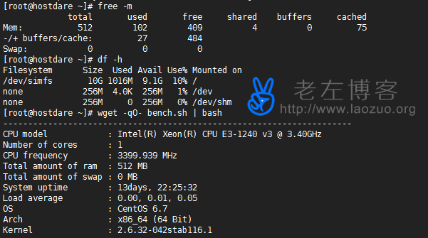 搁置在那边两周左右时间(HostDare – 洛杉矶 OVZ 512MB内存 10GB SSD硬盘 600GB流量 $0.75/首月),今天老左准备登入到机器中进行简单的个人体验,对于商家的靠谱性目前还是未知,因为我也是第一次接触这个商家,鉴于有特定用户的项目,短期使用应该问题不大,我看他们回复工单速度还是比较快的。