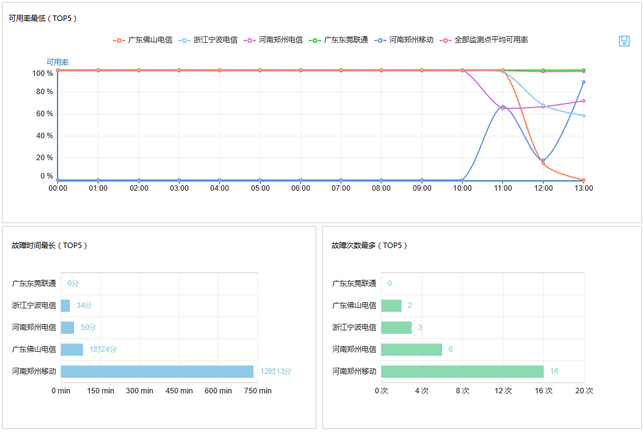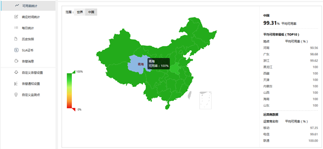 通过分布式监测网络,随时查看全国各地、甚至海外用户访问网站、服务器的状态,并自动生成可视化图表。饼图、曲线图、柱状图、体验地图,提供优雅视觉体验。然后我们可以根据响应时间、可用率地区分析所购买云主机、存储资源、网络资源、CDN的稳定性,并根据故障情况进行针对性调整和优化。