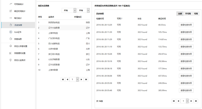监控宝免费版给用户提供了3个免费监测节点,企业用户则可以根据自己的业务和用户特点,从监控宝数百个监测节点中选择部署在不同地区、不同运营商的国内和海外监测点。