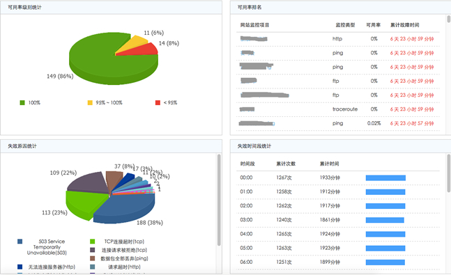 SLA报告可以帮助企业对监控项目进行整体分析和趋势预测。比如失败原因统计、稳定性级别、稳定性排名统计等待。每周一期,帮助您回顾和分析过去一周监控网站的整体性能。