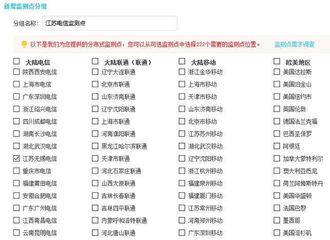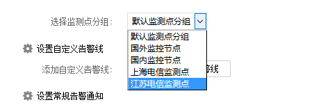 我们在自定义监测点之后,创建监控项目可以单独针对某个监控地区添加监控。这里我把江苏电信所有节点作为分组单独监控。