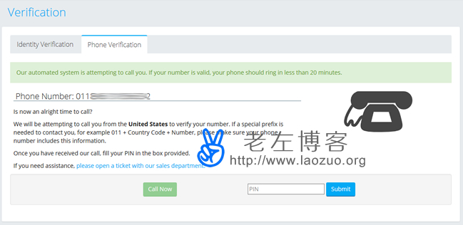 根据实际的介绍要求我们提交身份验证或者电话验证,我们肯定选择后者。根据提示会在一定时间里给我们来验证码填写后激活。这里老左遇到点小插曲,因为开始不知道一定要电话激活,所以电话号码开始没有写011开头,我本以为没有写肯定收不到激活电话,于是我提交工单过去,告知我是要激活的可能号码写错了所以无法激活。