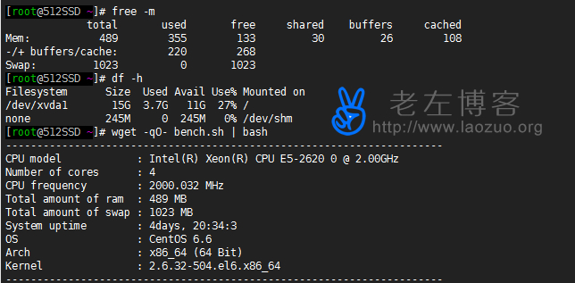 老左手上的这台机器是512MB内存(1024 Swap)、15GB SSD硬盘、CPU是E5-2620。