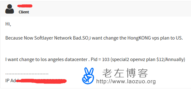 手中的一台HostUS香港机器好歹也是钱买回来的,还有半年左右才到期,根据网友书生可以跟官方更换成同等配置的美国机器的,所以老左也去联系官方客服,通过后台提交工单TICKET解决。同样的,老左准备把这个过程记录下来,如果也有网友有机器的,可以效仿更换成美国的,好歹速度上好一点,至少不闲置有点用途。