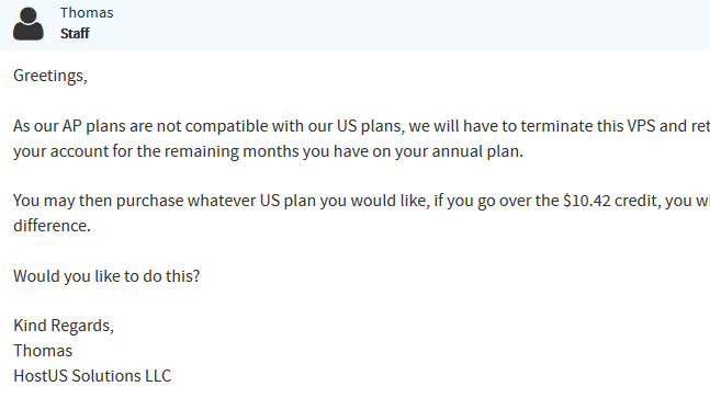 我这边给予的答复是不可以直接切换,但可以将剩余天数的时间折算成钱返到我账户中,然后将我这台香港机器停止我可以用余额购买US机器。这样也不错,需要我确认一下。(他问我是不是:Would you like to do this?)