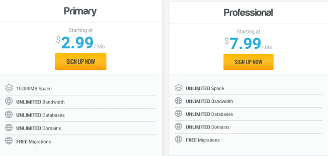 目前,Hawkhost老鹰主机拥有2个虚拟主机方案,分别是Primary以及Professional。如下图: