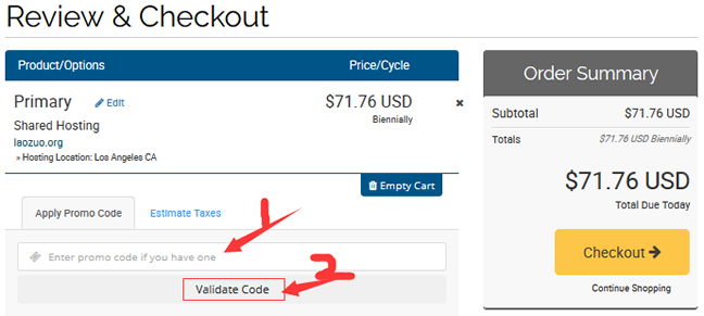 在图示的部分输入优惠码,点击Validate Code,即可优惠生效。