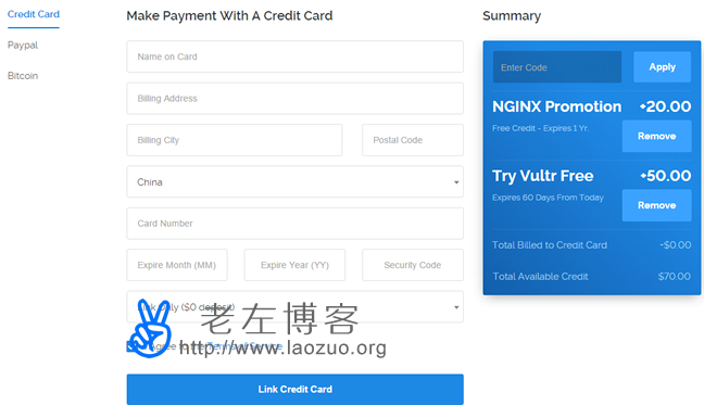 我们开始看到的是50美金余额,然后在ENTER CODE位置输入NGINX20优惠码后点击APPLY按钮就可以看到上图所示的50+20=70余额,这样在左侧需要且只能用到信用卡绑定(必须是在VULTR没用过的)。这样在注册后账户就会有70美金,其中50美金是有效期60天,20美金是有效期1年。