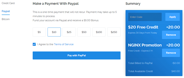 与上面类似,在ENTER CODE位置输入NGINX20优惠码,点击APPLY后会看到上图的20+20余额,其中20是有效期30天,20是有效期1年。如果用PAYPAL绑定需要支付最低5美金的充值余额(余额也是在我们账户中的)。